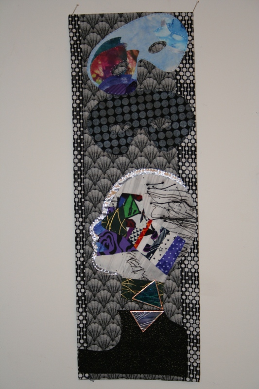 I have inner strength to help me live every day to the best of my abilities, no matter what I encounter. After breaking my neck, surgery added a titanium plate that holds my spinal column together. The mask of fear on the quilt is replaced with a mask of renewal- healing –growth.