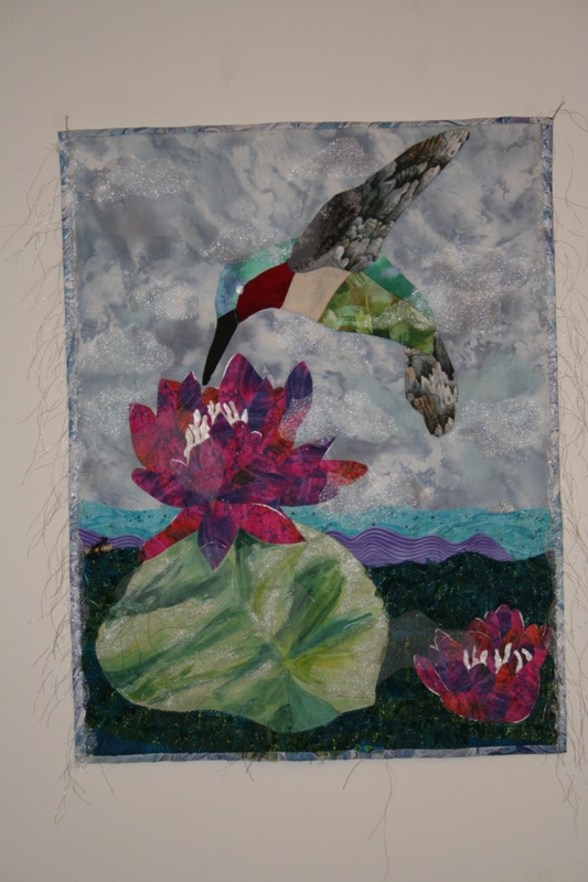 It is hand appliquéd , hand quilted, hand painted with acrylics, and layered with a 3-D effect.