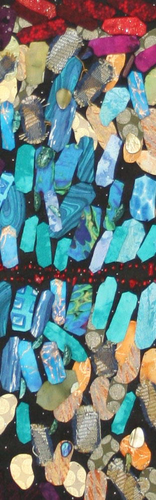 The background is hand quilted and machine quilted. Hand sewn embellishments include: Swarovski crystals, Czech glass beads, fiber optic beads, red coral, Betel nut halves and wooden beads. Both raw edge and turned under appliqué techniques are used to create the individual cells.