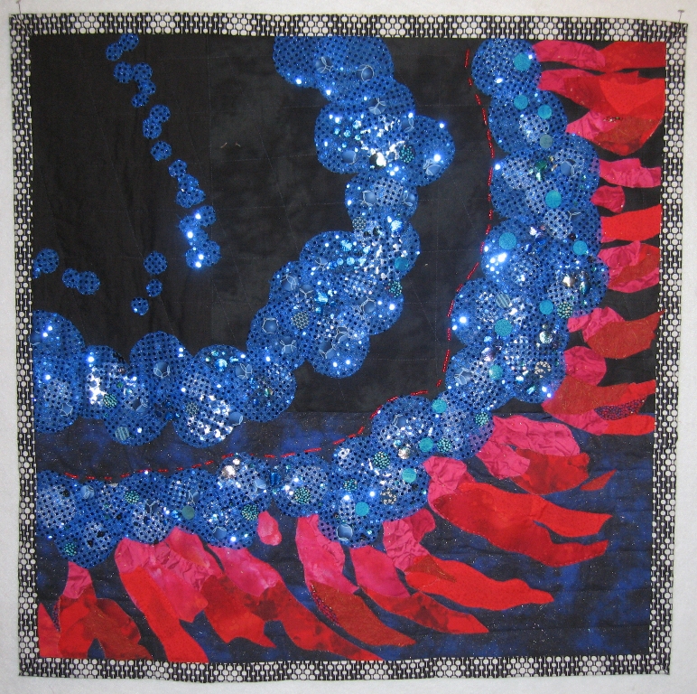 The blue spots are created with sequins covered with fabric and sewn by hand. The varying levels of circles are individually hand sewn, giving depth to the band of neuclei. The red photoreceptors include red fabrics and hand made paper. The middle, red portion is depicted using shades of red glass beads. The background is machine quilted with hand sewn embellishments.
