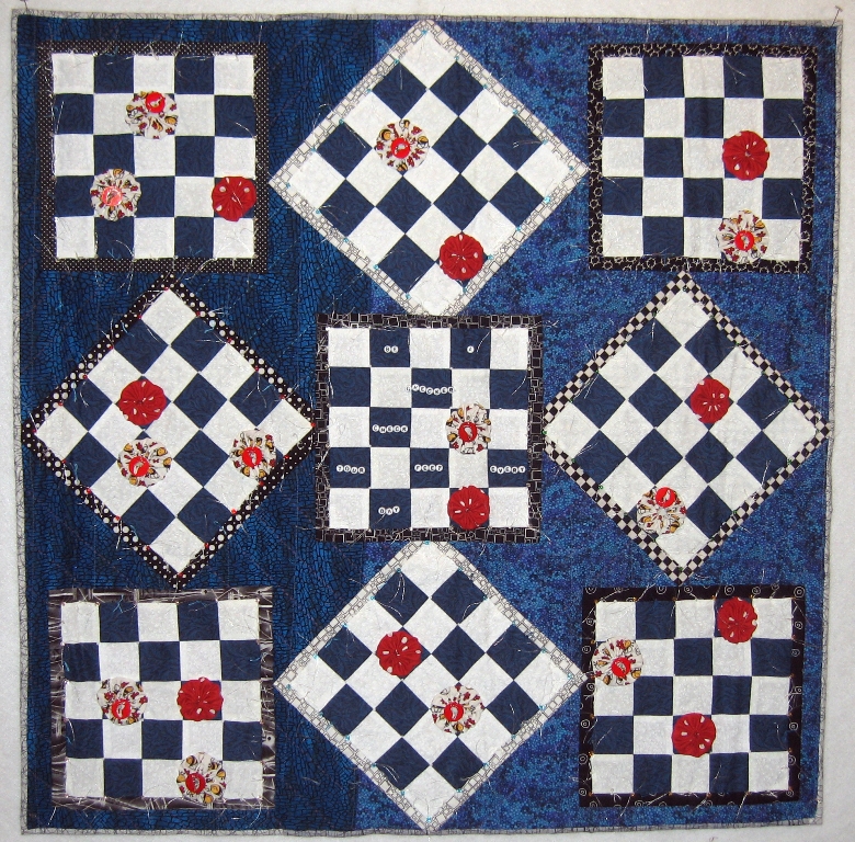 After talking to the head nurse at the Diabetes Center at the Inova Fairfax Hospital in Fairfax, VA, I was inspired to encourage those with diabetes to check their feet daily! Using the game of checkers as a fun referral to “checking” may influence patients to remember how very important it is to be vigilant about their feet before any bruise or sore can cause complications! When this quilt was completed, my daughter-in-law’s own grandfather with diabetes checked his feet and was helped by his doctors.