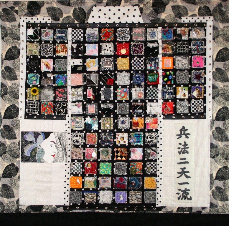Hyoho Niten Ichi Ryu is the way of the martial arts, the school of two heavens as one strategy. Developed by the great swordsman in the early 1600s, Miyamoto Musashi practiced his skills with ceaseless determination as he studied the purpose of his strategy. As a philosopher and artist, he devoted his life to striving for perfection. The quilt reflects the classical Japanese kimono with the modern fabrics and embellishments. The Japanese kanji states: Hyoho Niten Ichi Ryu. The philosophy inspires me to be vigilant as I dedicate my life to my artistry.