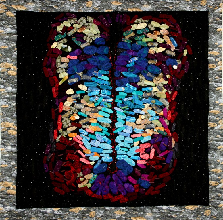 My quilt is a rendition of Zachary Gaber’s photograph of a developing chick embryo’s spinal cord. It is a cross-section of a four-day old embryo. I am thankful to have permission to use Mr. Gaber’s phenomenal photograph!